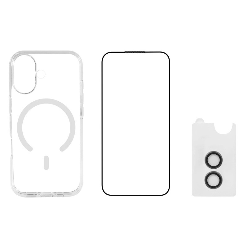 Koop de iPhone Starter Kit in de iServices Online Winkel. 3-in-1-set met een MagSafe transparant deksel, glasfolie en camerafilms.